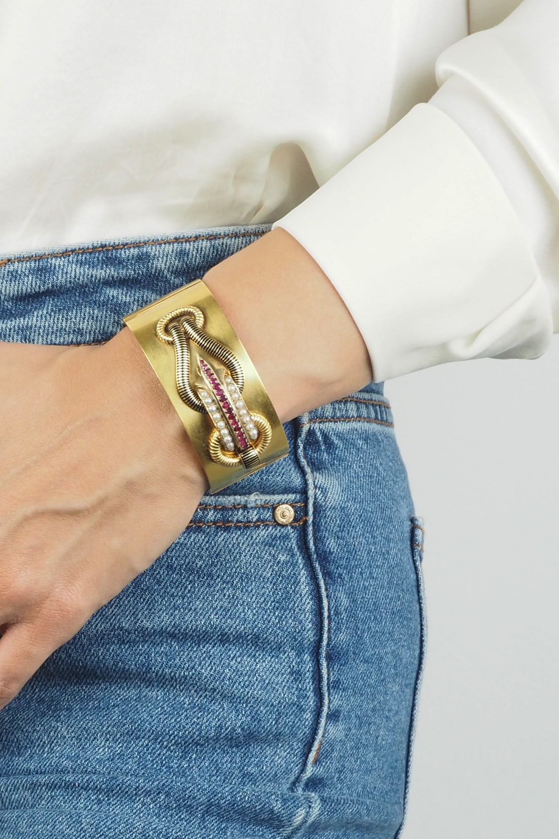 Ca. 1865 – French Gold Bangle with Pearls & Rubies